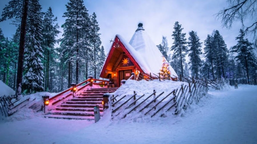 Η εικόνα δείχνει ένα σπίτι, στο οποίο πρέπει να ανεβείτε μια μεγάλη σκάλα. Γύρω από την κατοικία υπάρχει ένα δάσος κωνοφόρων, τα κλαδιά των δέντρων είναι λυγισμένα από τη μεγάλη ποσότητα χιονιού. Έξω από το σπίτι λάμπουν φώτα και ολόκληρη η αυλή είναι καλυμμένη με ένα παχύ στρώμα χιονιού, το οποίο καλύπτει σχεδόν εντελώς τον φράχτη.