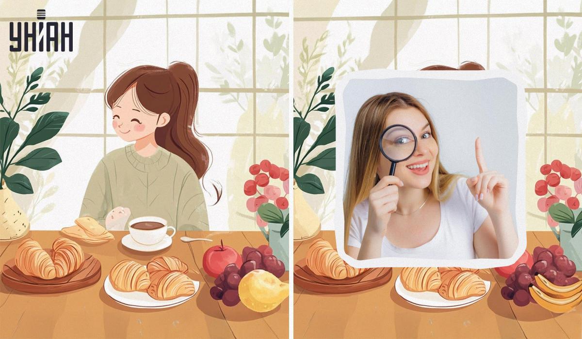 Οι εικόνες δείχνουν ένα χαριτωμένο κορίτσι να απολαμβάνει το πρωινό του στην κουζίνα του. Πίνει καφέ (ή τσάι) με νόστιμα κρουασάν. Και για επιδόρπιο, αναμένεται να έχει φρουτάκια. Οι εικόνες φαίνονται σχεδόν πανομοιότυπες, με τέσσερις λεπτές διαφορές μεταξύ τους. Θα μπορέσετε να τις βρείτε;
